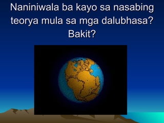 Ito ay pagkatapos isang hypothesis tungkol sa pinagmulan ng buhay ayon sa teorya ng creationist. Ano Tatlong teorya ukol sa pinagmulan ng Filipino.