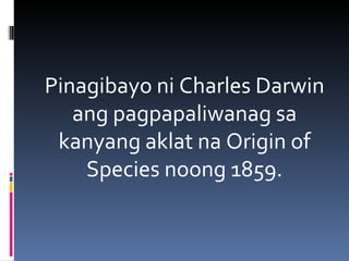Binago ni Charles Darwin ang henyong naturalista ang paraan ng pagkaunawa natin sa natural na mundo. Ang Ebolusyon ay ang pagbabago sa mga namamanang katangian ng mga populasyon ng organismo sa loob ng mga sunod sunod na henerasyon sa paglipas ng mahabang panahon. Ang karaniwang pinagmulan pabor sa ebolusyon.