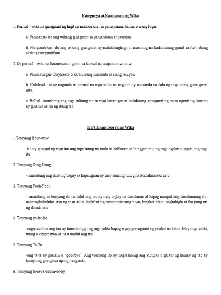 1mama theory- nagsasabing ang wika ay nagsimula sa mga madaling ibigkas na mga salita na tinutukoy nila sa mga bagay-bagay. Ta-ta theory- si Richard Paget na gumawa. Nabibigyang kahulugan ang mga komunikatibong gamit ng wika sa lipunan g from FIL 211 at University of the Philippines Los Baos.